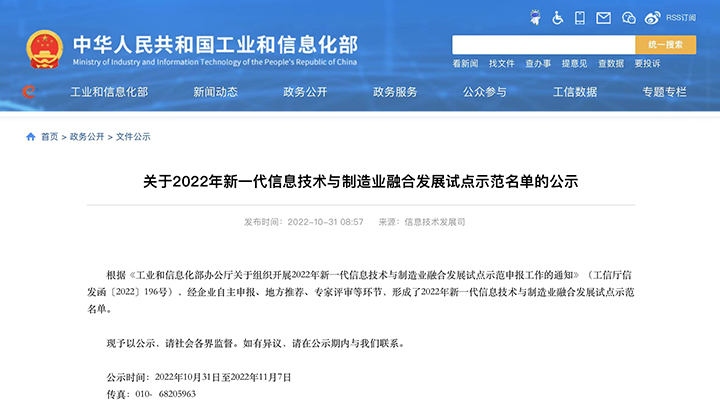 中首页集团子公司入选工信部2022年新一代信息技术与制造业融合发展试点示范名单